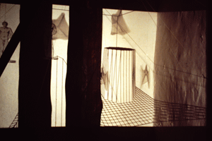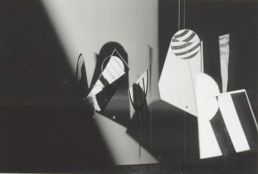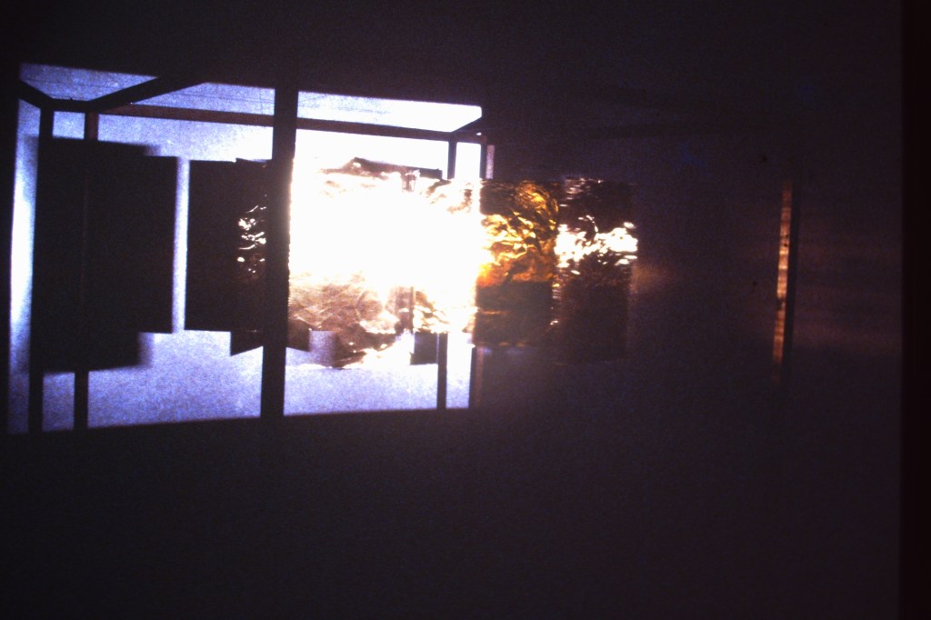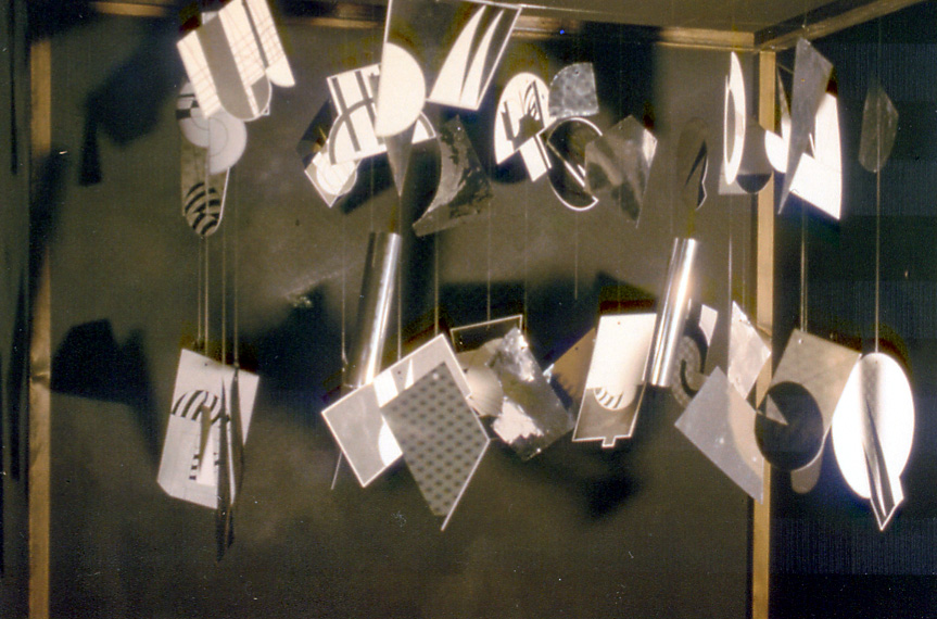 | Nella presentazione leggiamo: 1.In un ambiente cubico di tre metri di lato sono sospese disegni di forme geometriche in bianco e nero libere di ruotare su se stesse. 2.Le forme, piccole superfici specchianti ricevono e riflettono segnali luminosi continuamente variabili emessi da un proiettore. 3.Una parete nera con fori di apertura separa l’ambiente dallo spettatore. 4.Una colonna musicale accompagna gli impulsi luminosi ed i relativi riflessi. Su “Il giornale di Calcata”, Renata Masci scrive: “Nell’installazione, un continuo mutare di forme, di luci e di immagini colpisce l’uomo avvolgendolo in un universo di sensazioni visive in un contesto di movimenti reali e virtuali. Tale è la rete della comunicazione che viene emessa, trasmessa e ricevuta in un continuo mutare di tempi e di luoghi. Giovanni Carpentieri, in questa installazione, si ispira ai “Mondi niovi”. Così erano chiamate le macchine ottiche portatili, diffuse nelle piazze europee nel ‘700 e nell’800, consistenti in scatole fornite di un doppio foro munito di lente, attraverso cui si offriva la visione prospettica di luoghi lontani, di genti e usanze sconosciute, riportate su incisioni o vetri dipinti. Queste erano immagini di un linguaggio universale che mostrava nuovi mondi e genti diverse e lontane. Quel linguaggio visivo si è oggi tramutato in linguaggio comunicativo. Negli ultimi anni, l’universalità della comunicazione è un sogno quasi realizzato. A permettere ciò è la telematica, che ha in se le possibilità di comunicazioni globali e simultanee. Per suo tramite, l’immagine e l’informazione interagiscono tra spazi, luoghi e operatori diversi creando, al di là delle implicazioni sociali, profonde e coinvolgenti emozioni culturali”. |