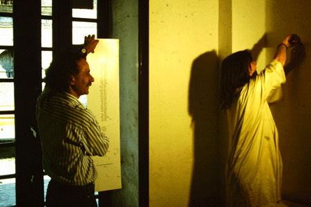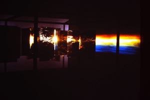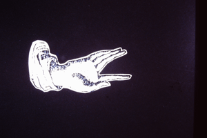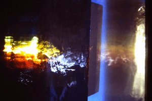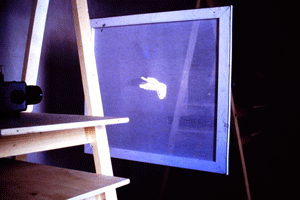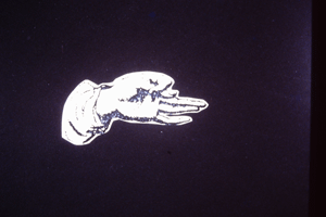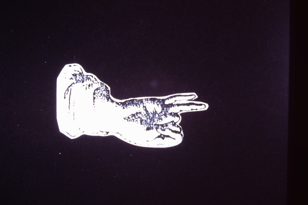 | 1.”A” e “B” sono due entità di uno spazio e comunicano tra loro attraverso due proiettori che proiettano immagini di antichi linguaggi ottenuti con le dita delle mani, vengono comandati da una centralina per dissolvenze. 2.Immagini vengono proiettate e si fondono su uno schermo semitrasparente e possono essere viste da entrambi i lati. 3.Un suono accompagna le immagini. 4.Lo spettatore, muovendosi nello spazio è libero di attraversare le immagini e di esserne attraversato. In realtà lo spazio è senza limiti, le immagini e il suono senza tempo e i proiettori sono qualsiasi mezzo per comunicare. Lo spettatore è al centro di questo microcosmo-macrocosmo ed è fruitore, oggetto e soggetto della comunicazione. Giuseppe Salerno scrive: “E’ il luogo della comunicazione, la rete attraverso cui la tecnologia ha annullato le distanze fisiche e su cui prosegue il cammino dell’uomo verso il superamento delle distanze mentali. Un flusso di energia tra A e B, intercettato nella sua manifestazione luminosa da uno schermo che ne evidenzia al centro meccanismi che ed implicazioni, è il tema di questo lavoro. Essenziale nell’uso dei materiali e delle immagini, Network” evidenzia, con il semplice uso di due proiettori, l’incontro di volontà e pensieri in una dimensione apparentemente estranea ai soggetti che la promuovono. Proiezioni e coinvolgimenti psicologici sono leggibili in un processo di comunicazione che, dietro un’apparente linearità formale, è presente in tutta la sua complessità”. |