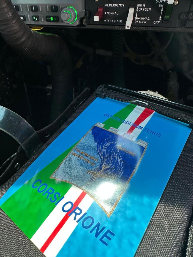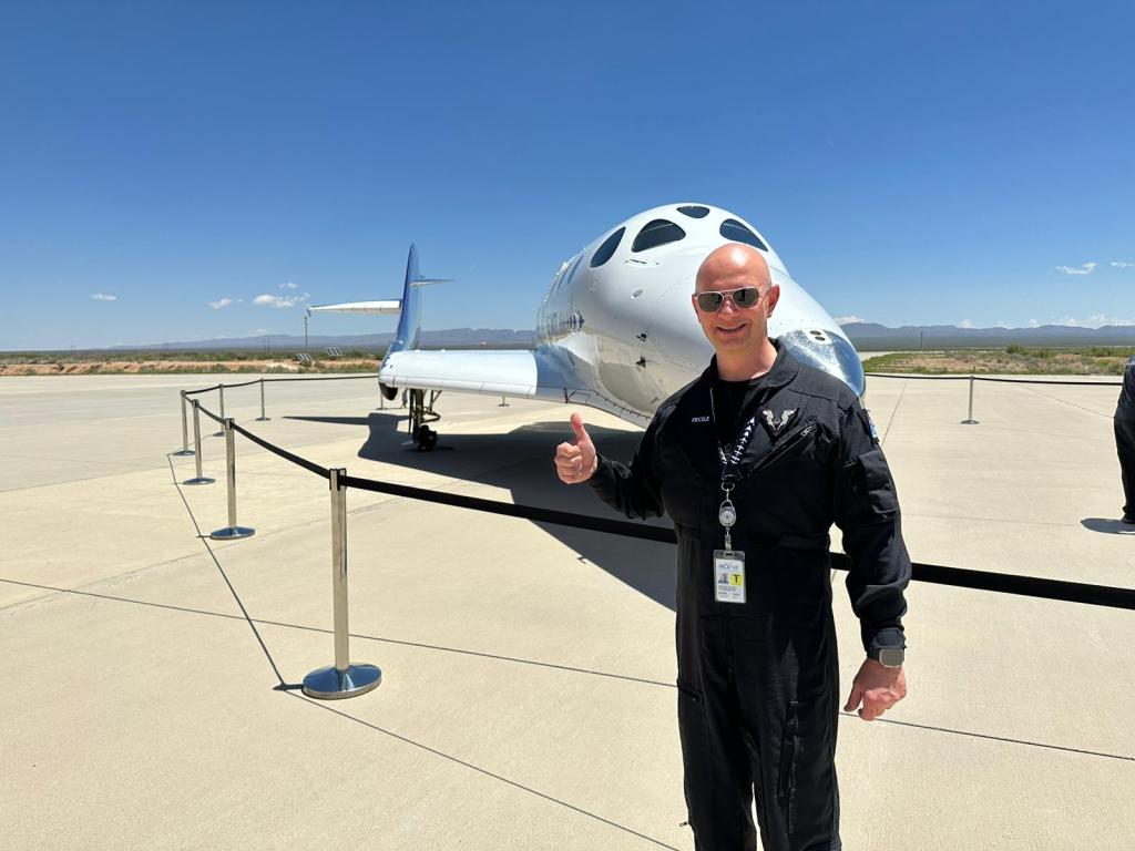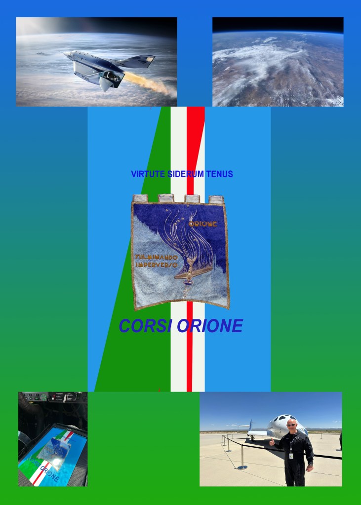 Poster in ricordo della locandina disegnata da Giovanni Carpentieri portata nello spazio con un volo suborbitale dal Comandante Nicola PECILE pilota della navetta. Nicola Pecile, friulano, uno dei piloti colladuatori attualmente alla Virgin Galactic, ha frequentato l’Accademia Aeronautica con il corso Orione IV.
