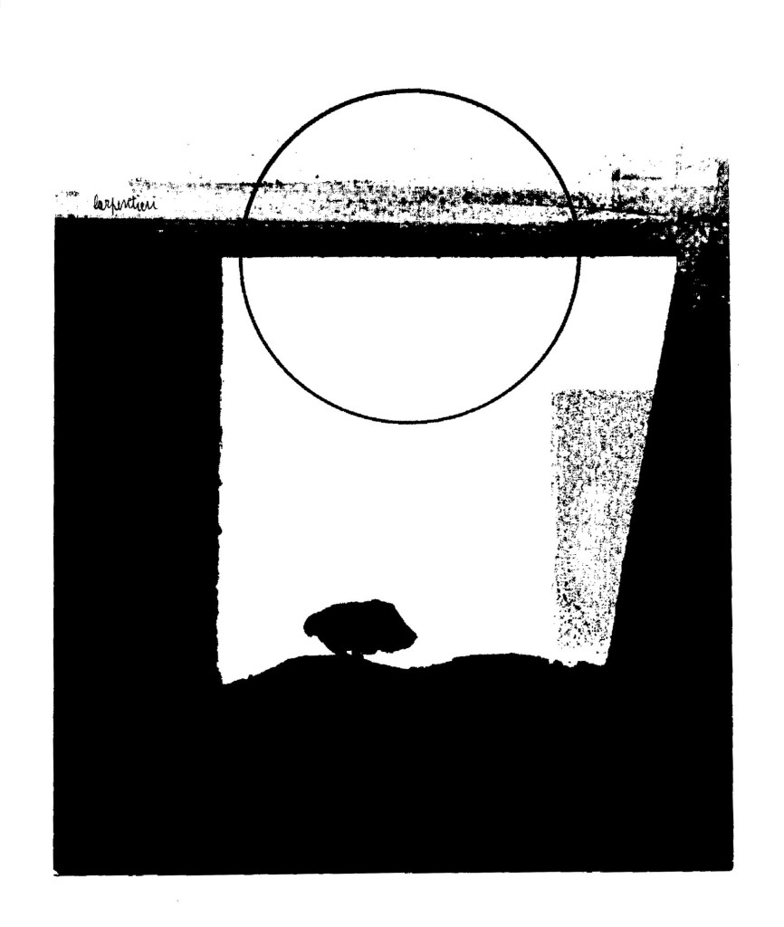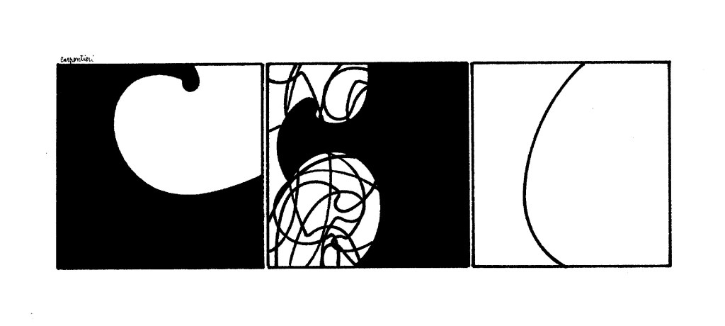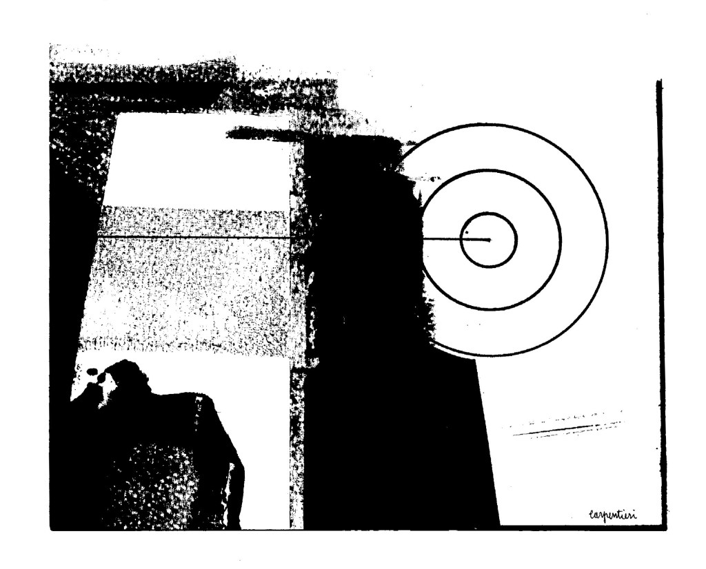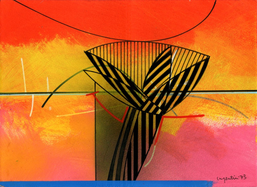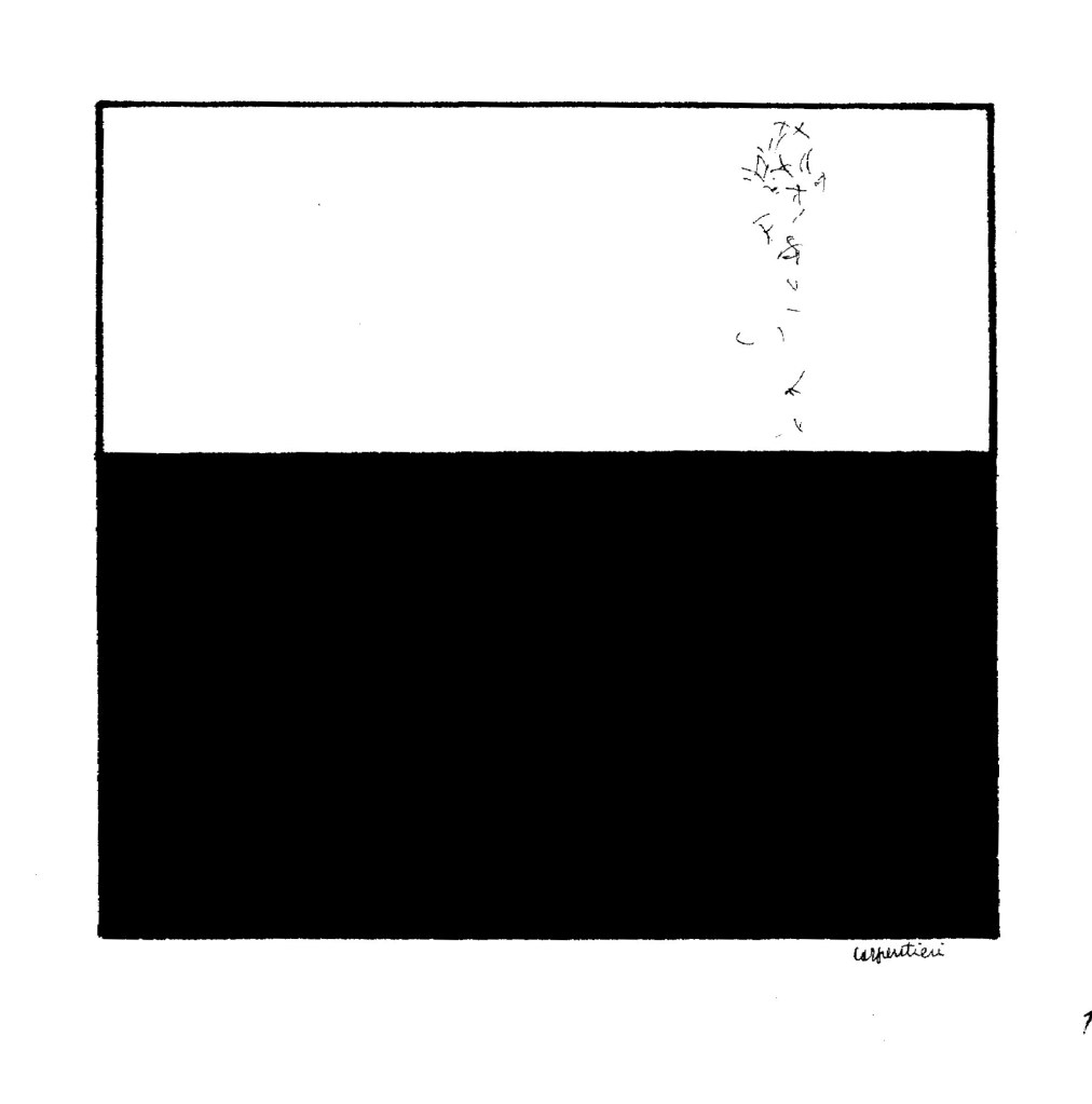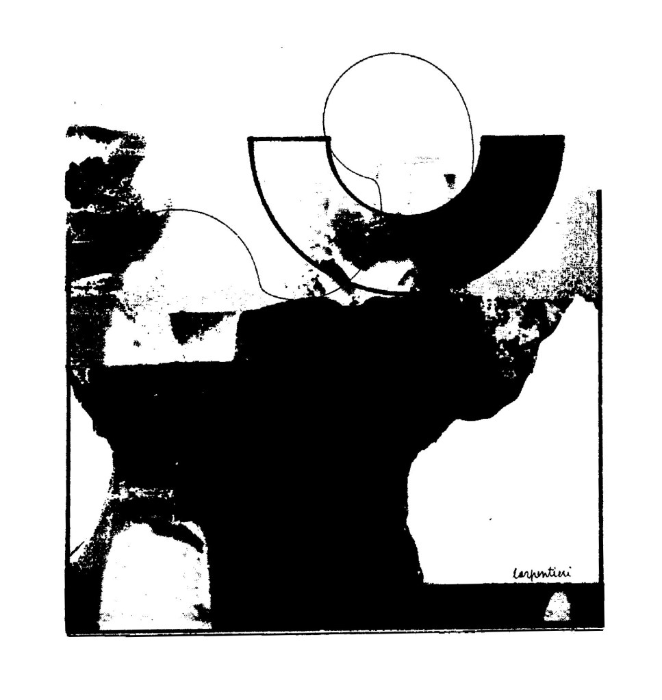 Un giorno del 1966/67, nello studio di Lucio Fontana a Milano, Carpentieri vede che l’assistente giapponese del maestro mette della garza nera nella parte posteriore dei tagli. L’idea, in queste opere, è, al contrario, di spruzzare del colore nero spray sul cartoncino 70X50 attraverso tagli su fogli di giornale. Nelle opere vi è già una idea prevalente di verticalità e una qualche energia è data dalla imprevedibilità dell’atto gestuale.