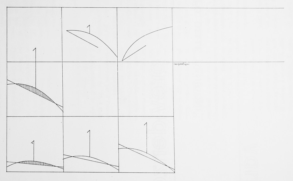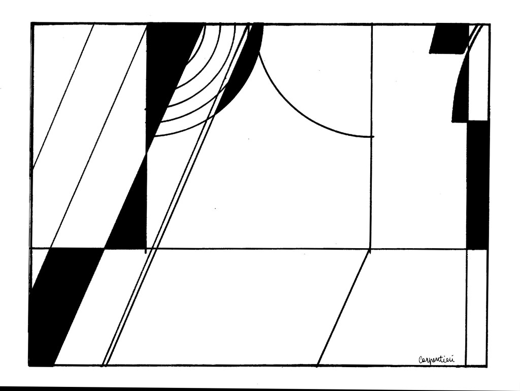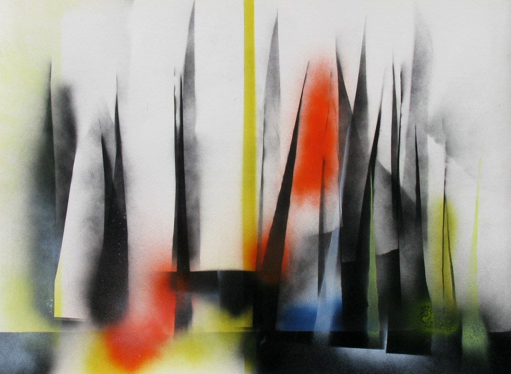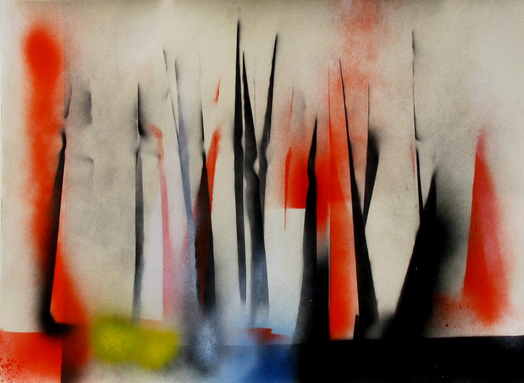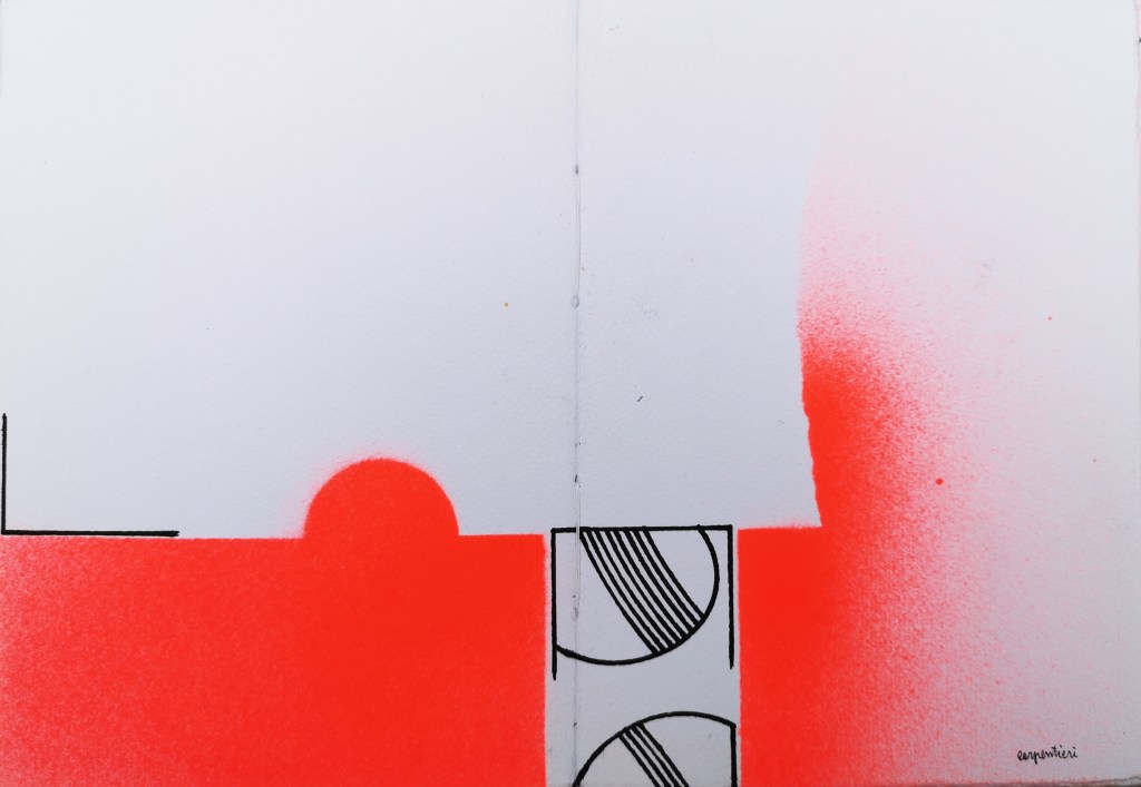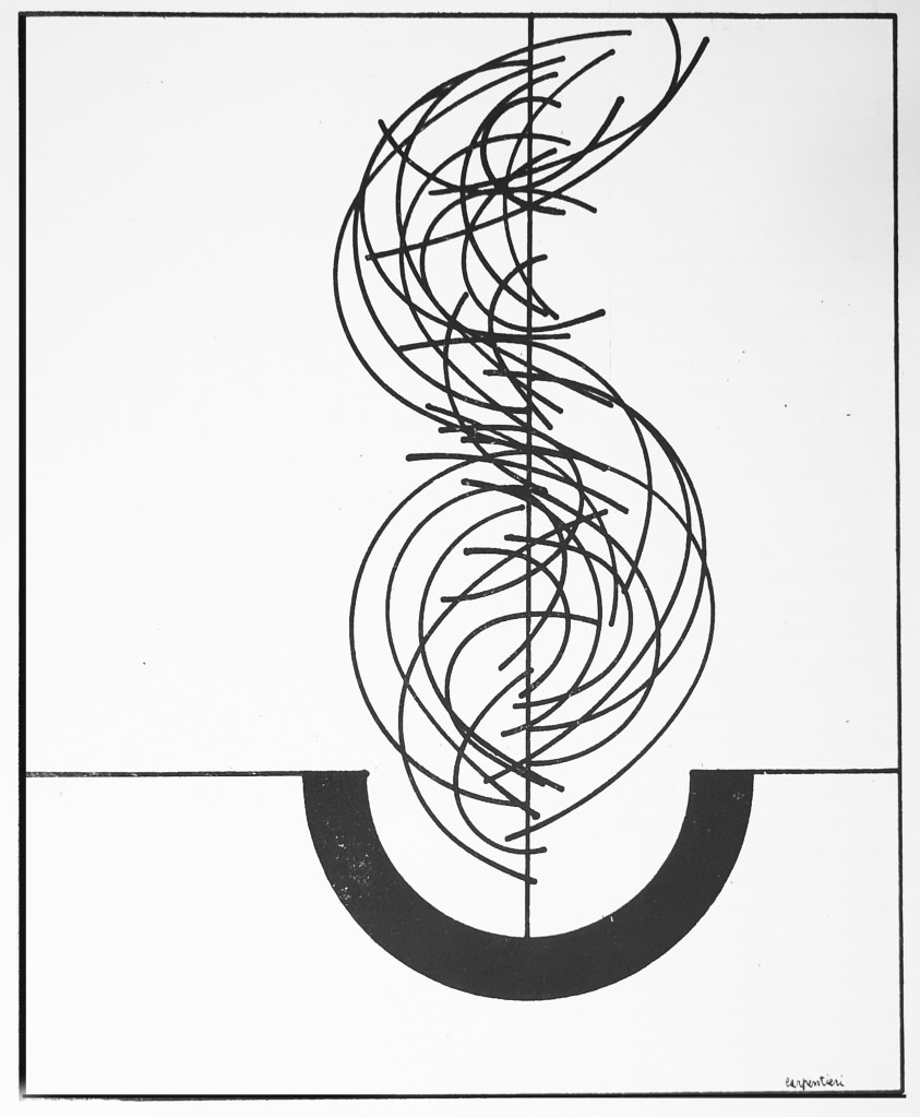 Un giorno del 1966/67, nello studio di Lucio Fontana a Milano, Carpentieri vede che l’assistente giapponese del maestro mette della garza nera nella parte posteriore dei tagli. L’idea, in queste opere, è, al contrario, di spruzzare del colore nero spray sul cartoncino 70X50 attraverso tagli su fogli di giornale. Nelle opere vi è già una idea prevalente di verticalità e una qualche energia è data dalla imprevedibilità dell’atto gestuale.
