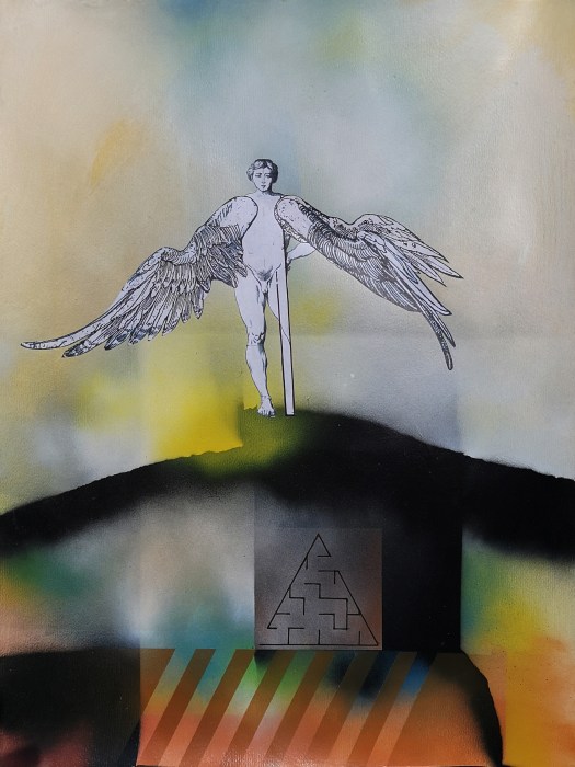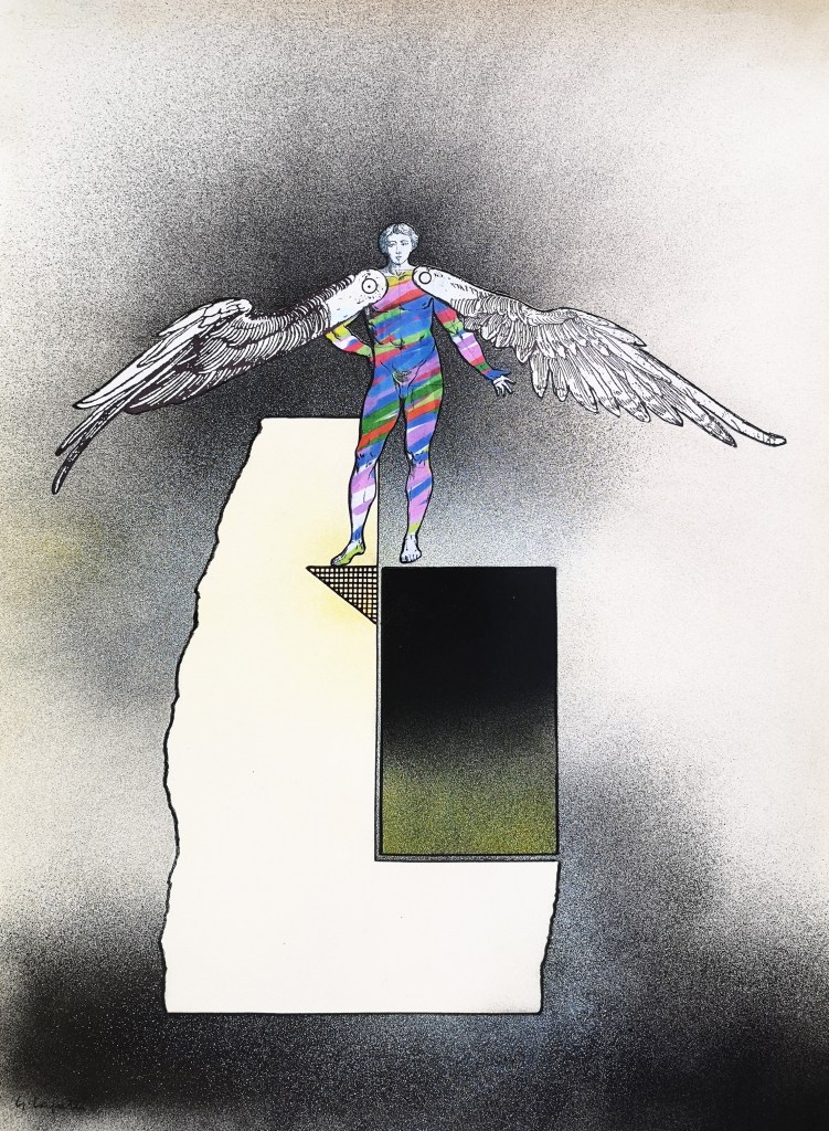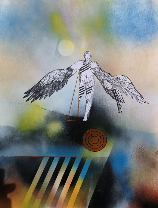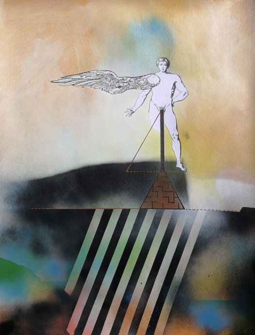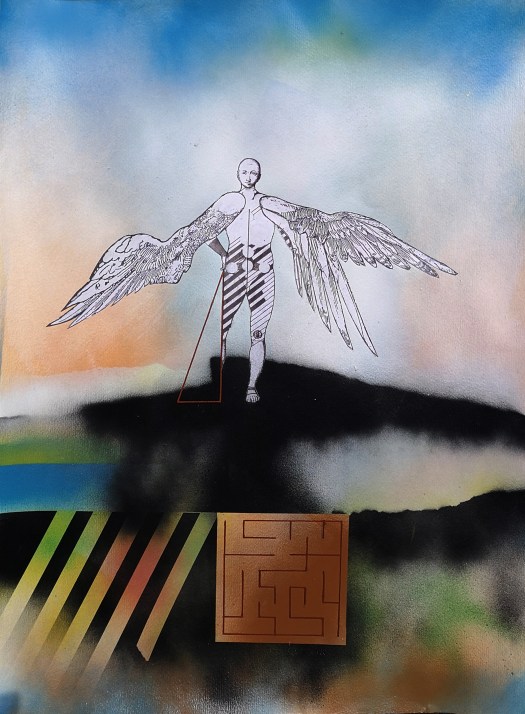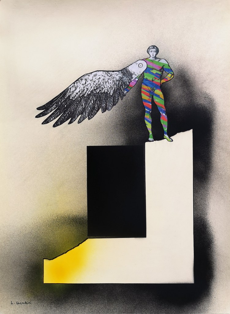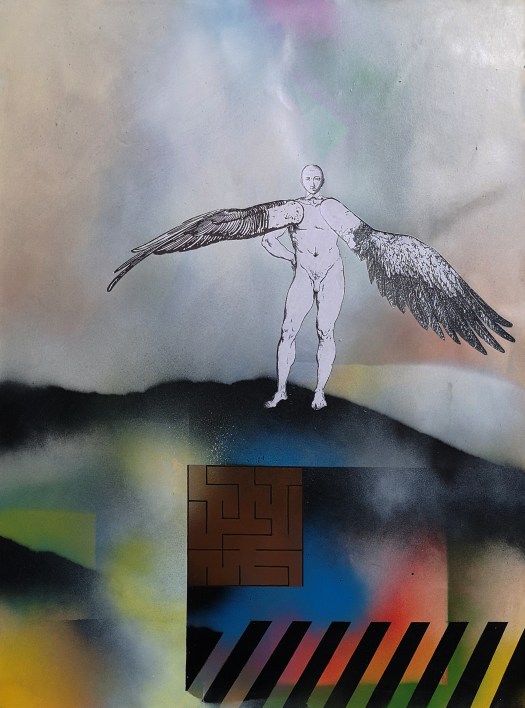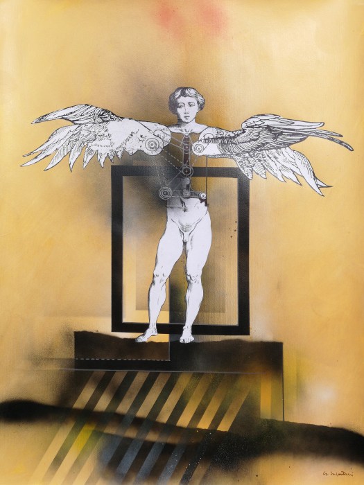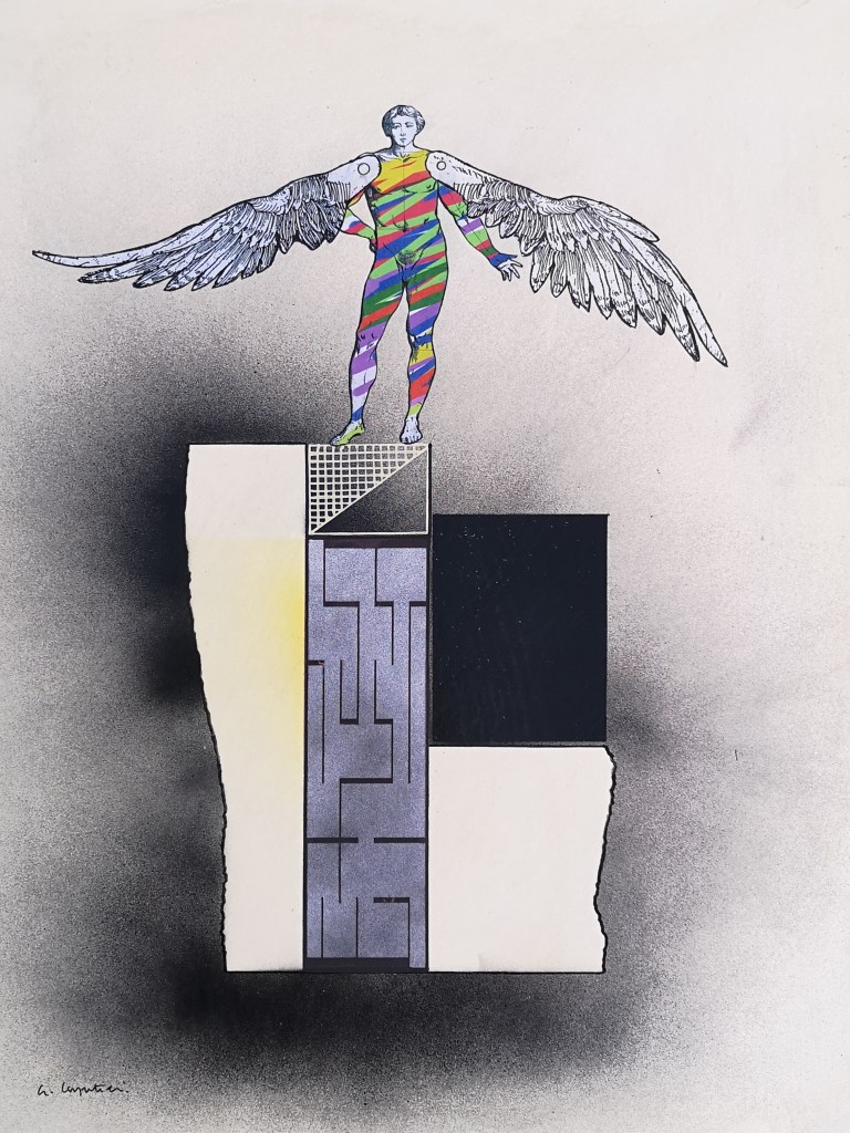 Le architetture e i labirinti che accompagnano queste figure non sono semplici fondali: sono spazi di tensione e di misura, luoghi in cui la verticalità incontra la caduta, la libertà si intreccia alla regola. Così, in queste opere, mito e razionalità, utopia e costruzione tecnica, memoria storica e ricerca contemporanea convivono, restituendo la grande metafora del volo: il sogno umano di superare i propri confini, pur sapendo che ogni volo comporta il rischio della caduta.