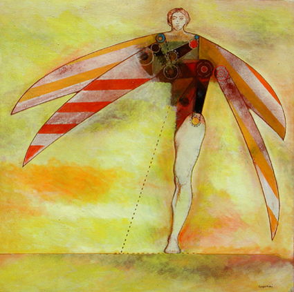 L’uomo-uccello ci sembra pesante, egli stesso sembra aver dubbi sulla possibilità di volare; malgrado ciò, quasi prigioniero del suo stesso ruolo e del destino che si deve compiere, è pronto ad osare.