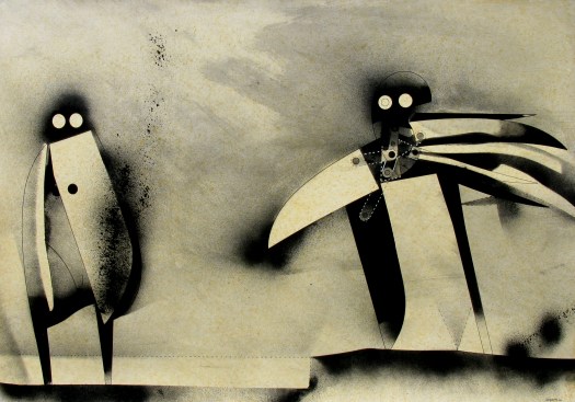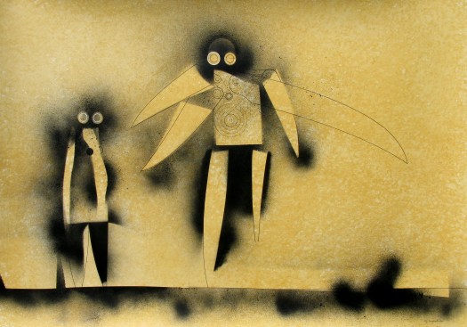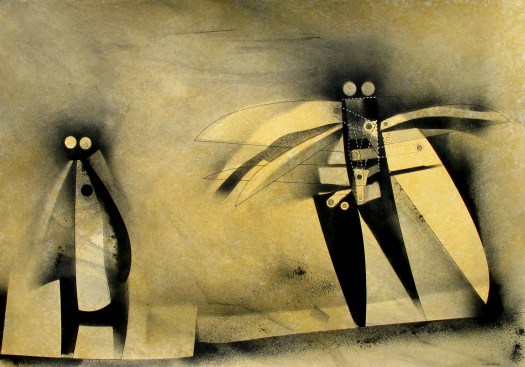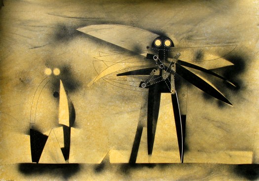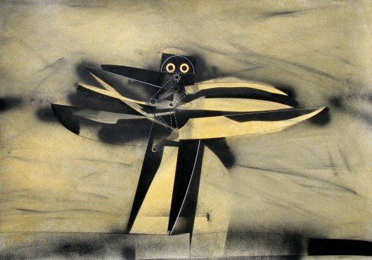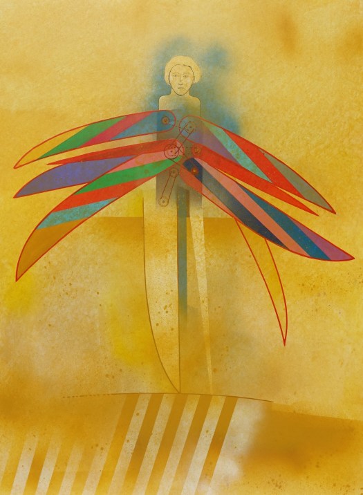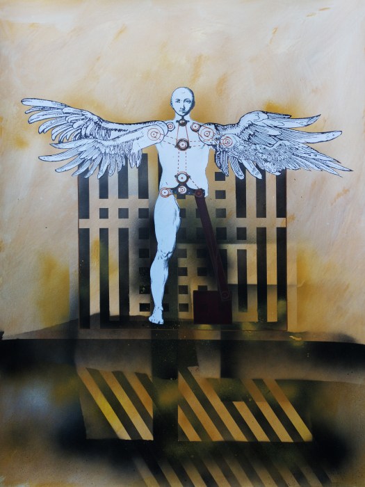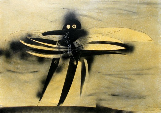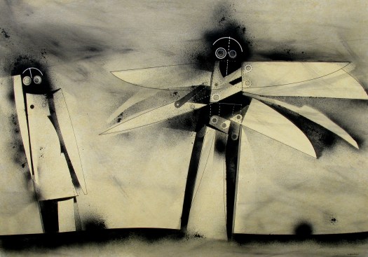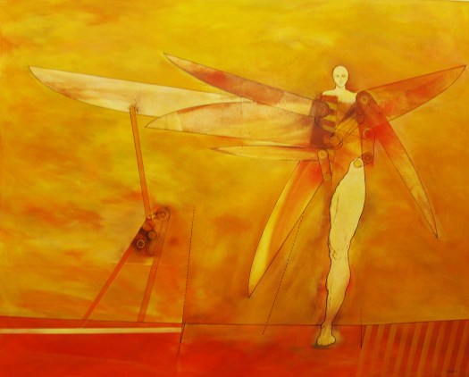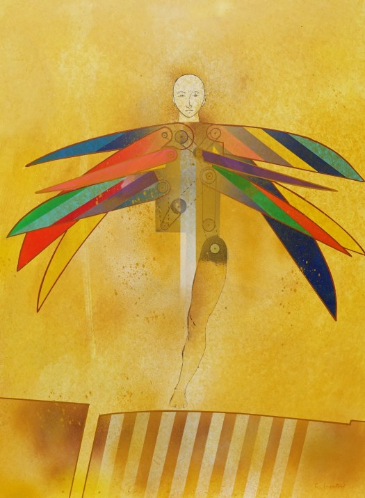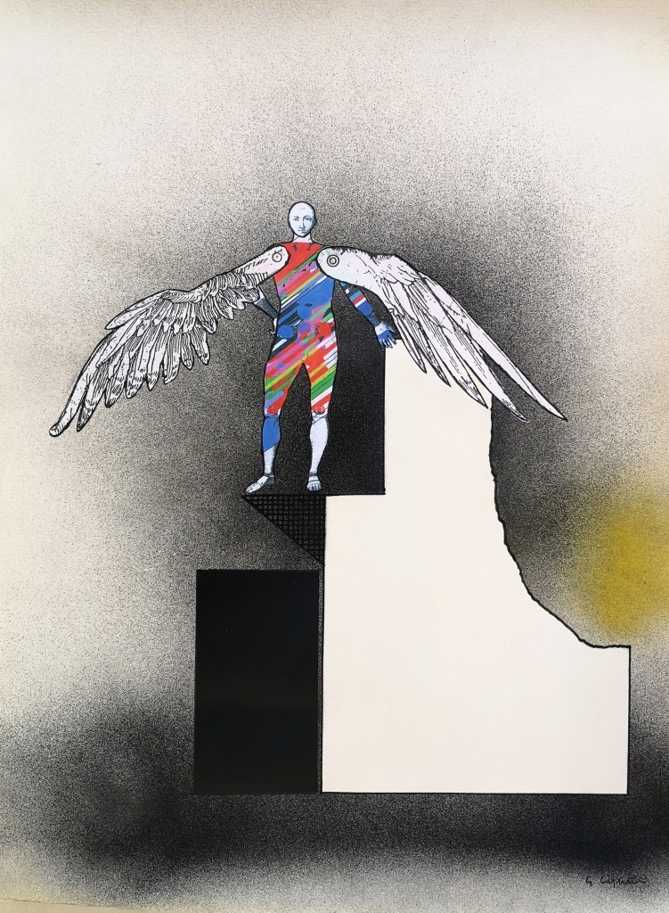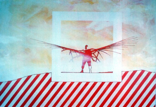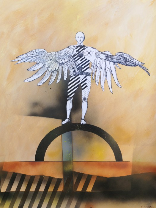 “Una decina di anni fa avevo disegnato degli uomini-uccello, delle forme di esseri volanti, ma erano per lo più forme grafiche o collage dove venivano sintetizzati e resi essenziali i simboli, le misurazioni, le forze aerodinamiche del volo”.