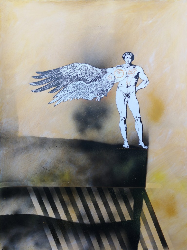 Il corpo è quello dell’uomo razionalizzato dall’Encyclopédie di Diderot e D’Alembert, il “manichino” proporzionato che l’Illuminismo volle a fondamento delle arti e dell’architettura. Le ali, invece, provengono dall’universo di Dürer, maestro capace di restituire alla natura la sua precisione e al sogno la sua potenza simbolica.