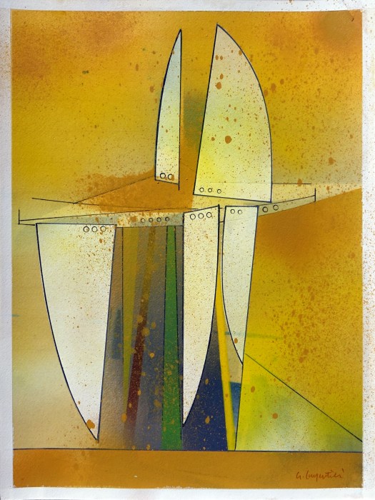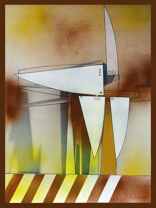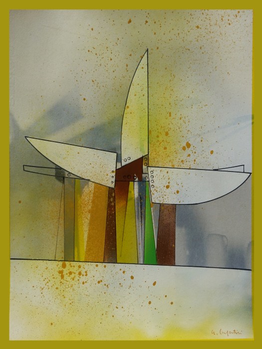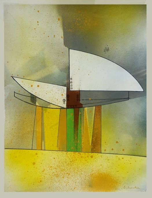 “A volte mi piace un tipo di immagine grafica molto essenziale e più aderente al monto meccanicistico o il simbolo puro, a volte ritorno alle forme astratte, alle forme-idea. Mi sembrano più misteriose e mi fanno giocare di più con il colore. D’altra parte, guardando bene, gli aerei sono come delle grandi sculture e le pagine dei manuali di volo, le descrizioni tecniche dei particolari e i grafici delle prestazioni di un aereo hanno una propria bellezza estetica”.