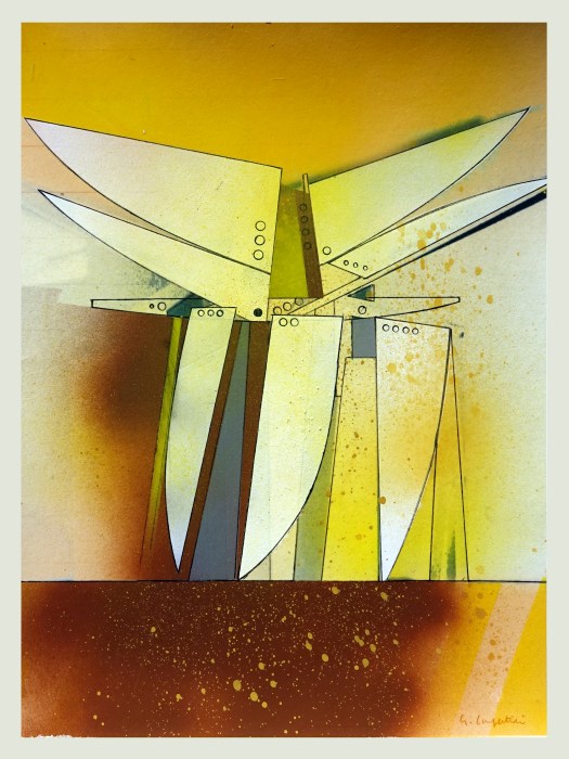 “Si, sono forme che vedo da anni. Ma ho anche in mente gli studi sul volo di Leonardo, gli Icari del mio amico Roberto Crippa, le ali colorate delle farfalle e le foto storiche dei pionieri del volo. A proposito di questi pionieri, sono sempre stato affascinato dalla figura di Otto Lilienthal, così come lo vediamo nelle foto che ce lo mostrano, sicuro di sè e con quelle grandi ali. E’ un Icaro vero, è morto quarantenne durante uno dei suoi voli. Deve essere considerato il primo pilota del mondo. Ho usato spesso le foto a lui fatte e quelle ai primi voli dei fratelli Wright”.
