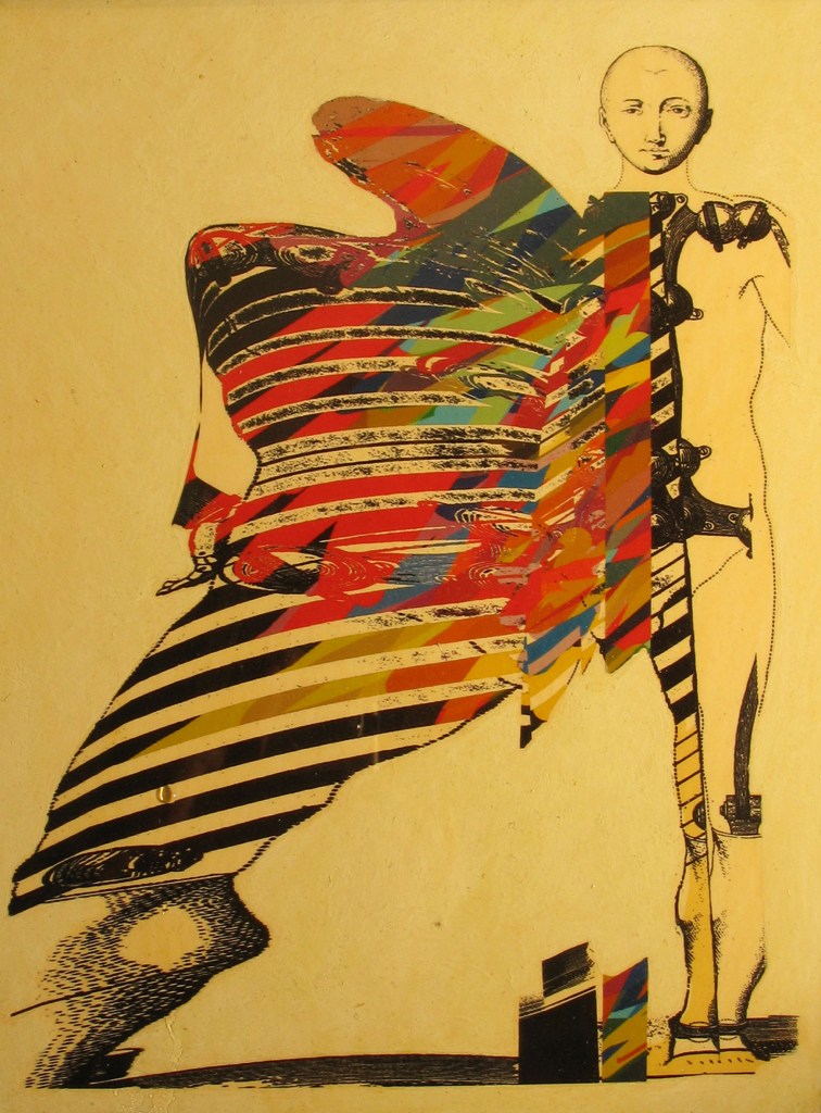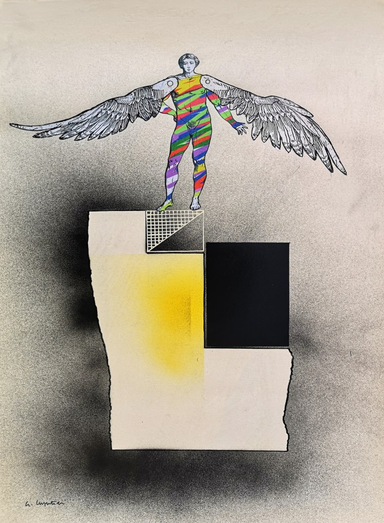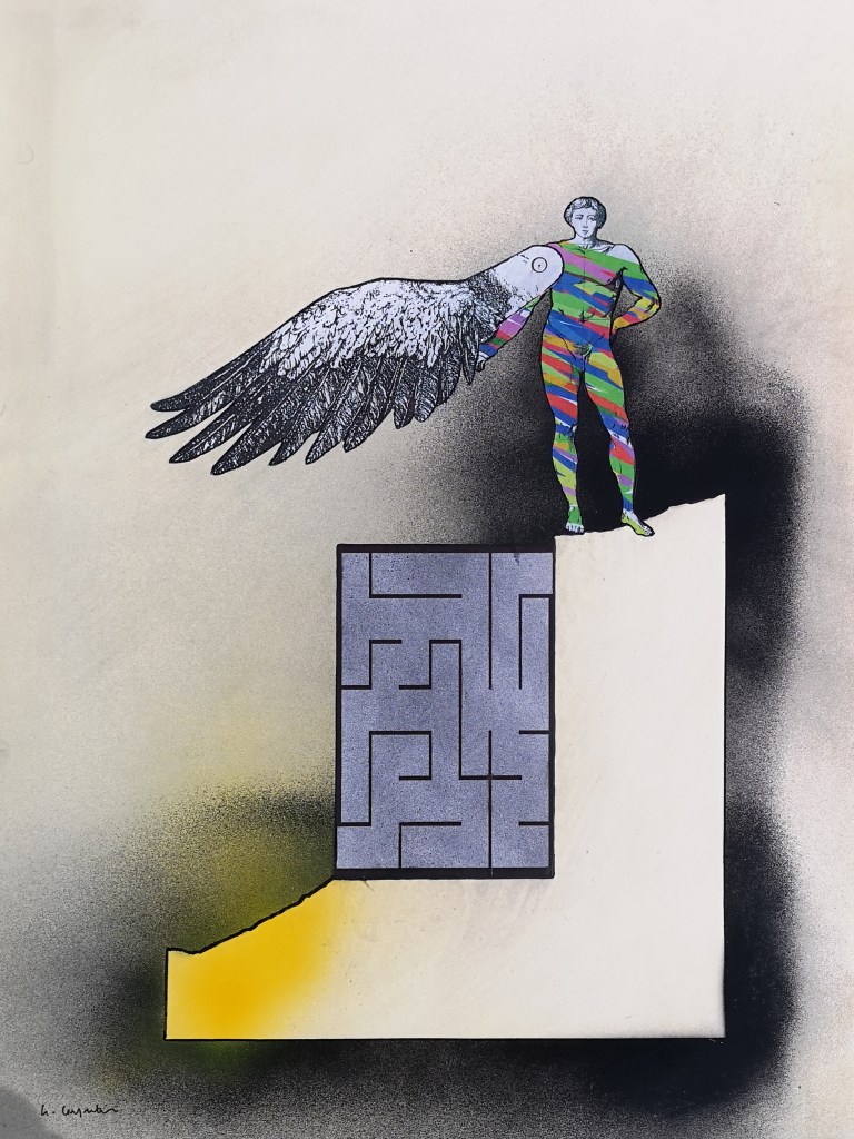 Le ali, tratte da incisioni di Dürer, aggiungono una dimensione visionaria e poetica: il sogno di volare si veste di memoria rinascimentale, di quella tensione verso l’infinito che unisce conoscenza e bellezza. Ma accanto al mito e alla memoria, vi è sempre la costruzione: geometrie, labirinti, meccanismi. Sono strutture che parlano di stabilità, di ordine, di un equilibrio cercato anche nella precarietà del volo.