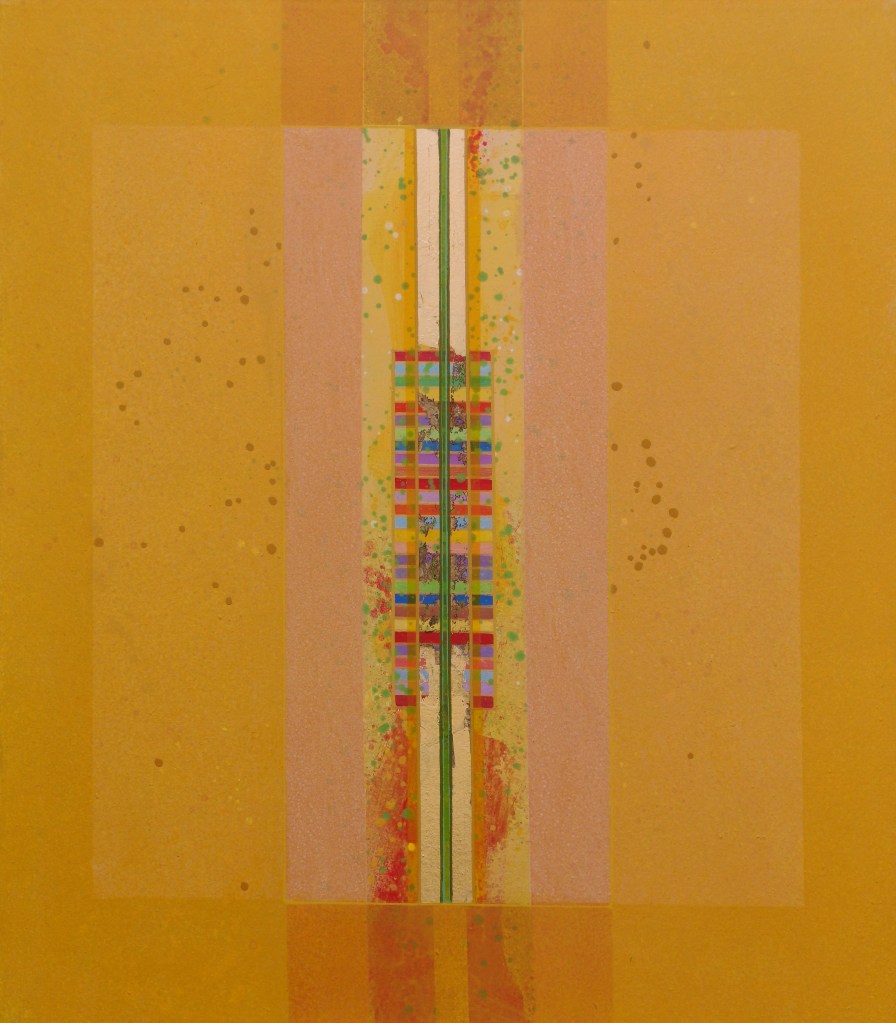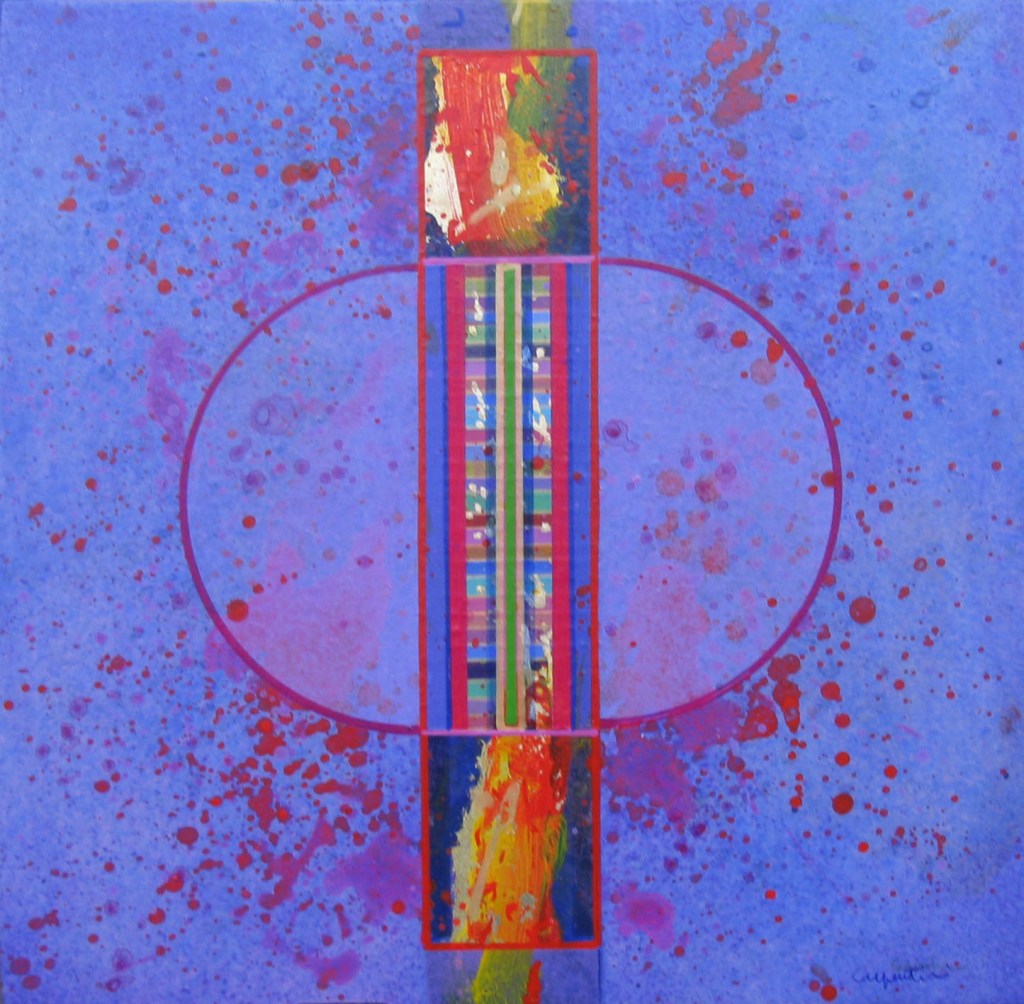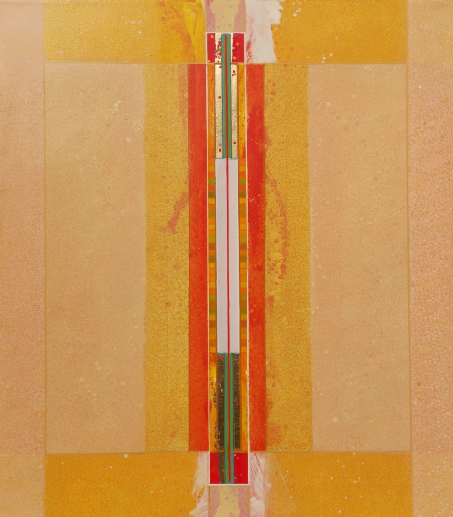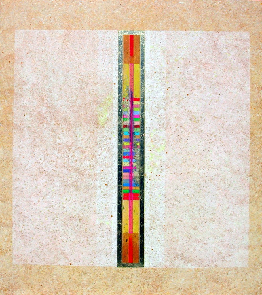 Su queste superfici di varie misure, percorse da una tensione generata dal colore, dalla materia e dal luccicare dell’oro, si fondono la geometria e la macchia, il sacro e il profano. L’idea delle strutture geometriche primarie e della verticalità come connotazione ascensionale sono state sempre presenti nella ricerca artistica di Giovanni Carpentieri. Una verticalità associata alla crescita, alla vita e ad una visione positiva del mondo e del divenire