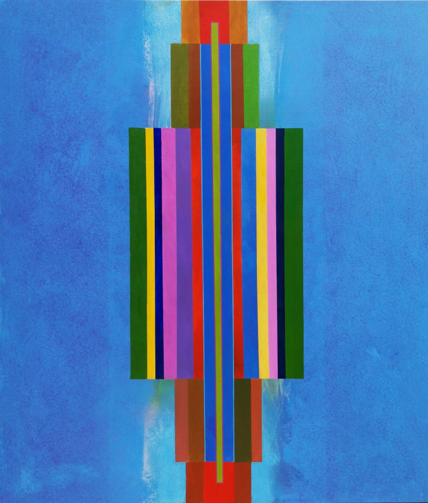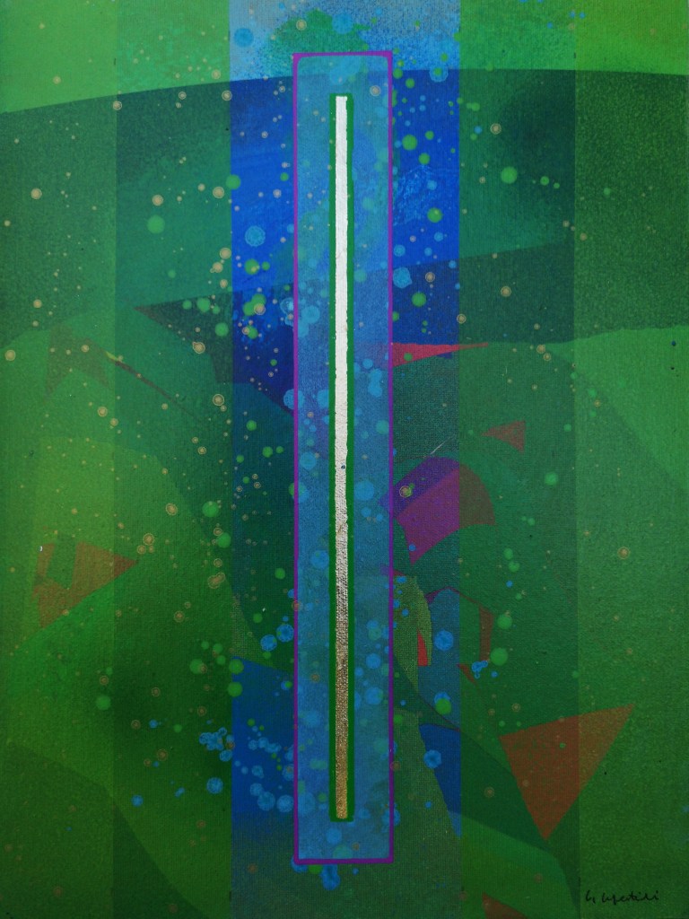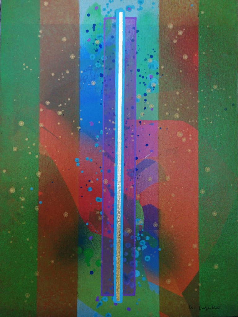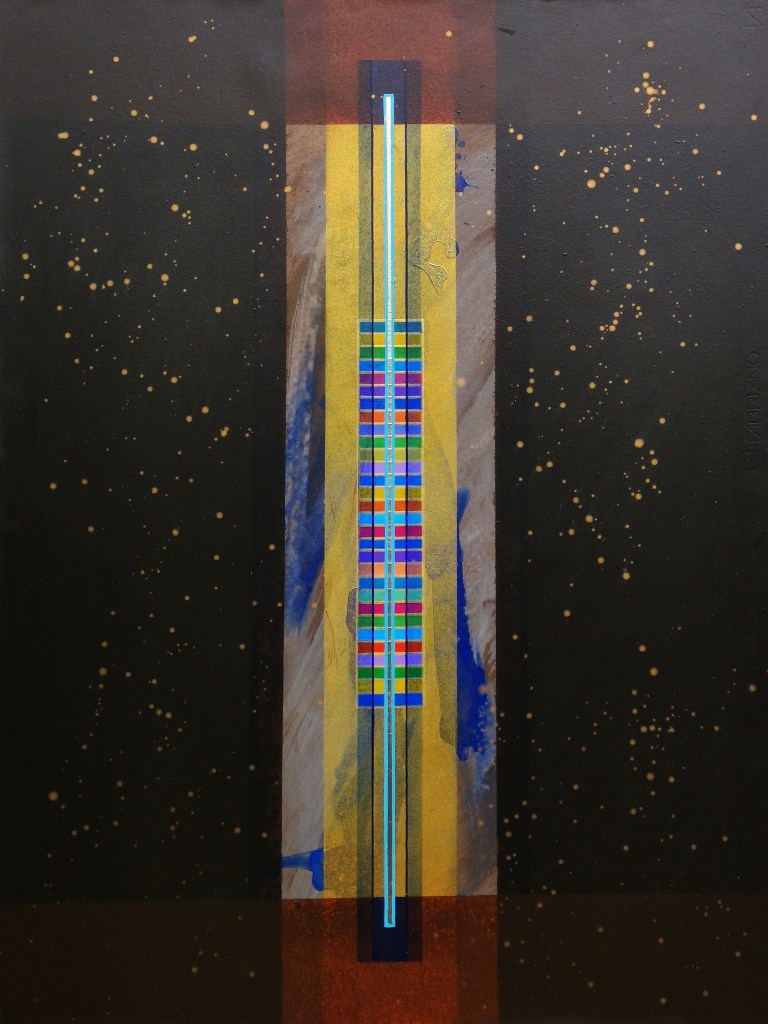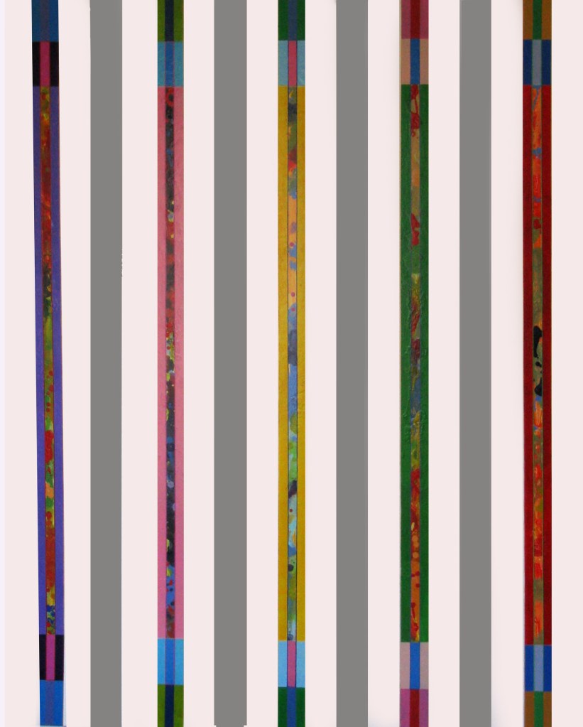 L’idea dell’albero visto come simbolo di congiunzione degli opposti, in un continuo susseguirsi di cicli, è antica ed universale. Alberi della vita, “alberi cosmici” visti come ascesa dalla terra al cielo, dalla materia allo spirito, da una condizione primitiva ad una più elevata. Anche questa ricerca vuole accostarsi all’idea dell’albero del mondo. La verticalità è essenziale nella simbologia dell’albero. E’ vita e qui viene rappresentata da un asse che collega il basso con l’alto, un asse interiore che, avente la base sulla terra, si evolve verso il cielo. Il colore è energia vitale, quella che permea tutto l’universo. E’ energia positiva, dinamica, quella stessa che viene evidenziata dalle foglie, dai frutti e dagli uccelli colorati presenti nel-le immagini medievali e rinascimentali che rappresentano la natura. Anche la forma geometrica è energia positiva. Nella sua essenzialità racchiude l’ordine e la razionalità. Fanno parte di una geometria simbolica le strisce parallele che servono da linee di congiunzione tra la morte e la vita e viceversa, in un’idea di rigenerazione che trascende lo spazio e il tempo.