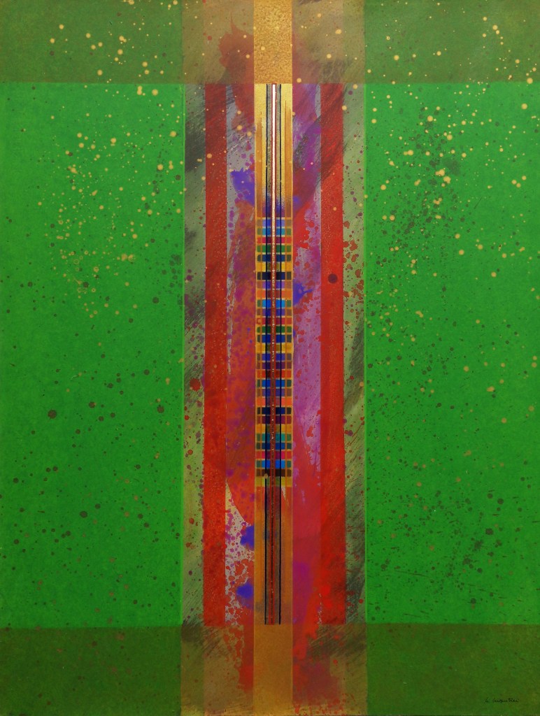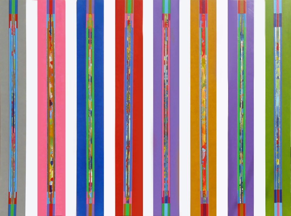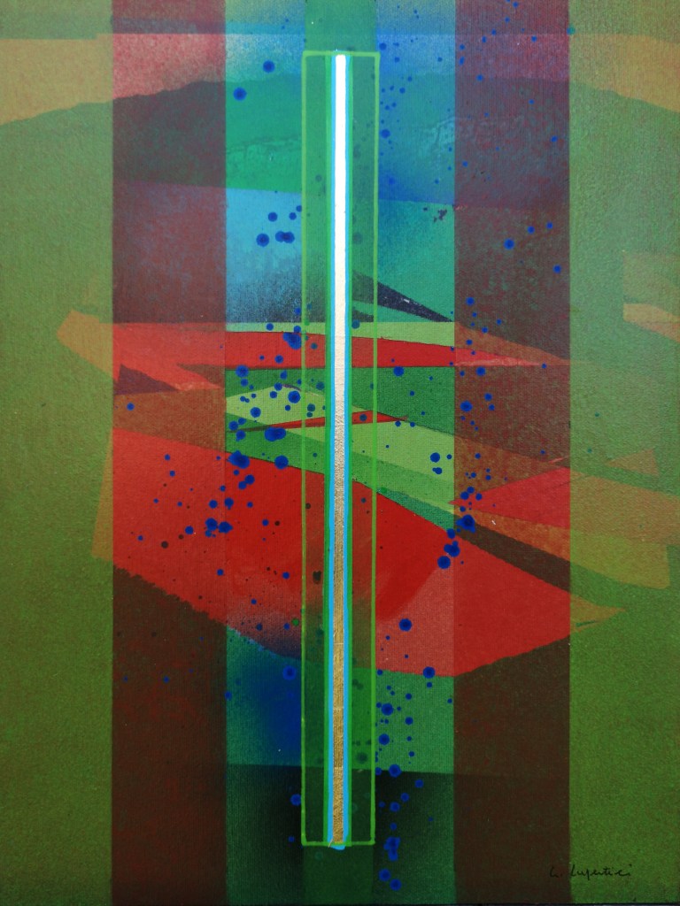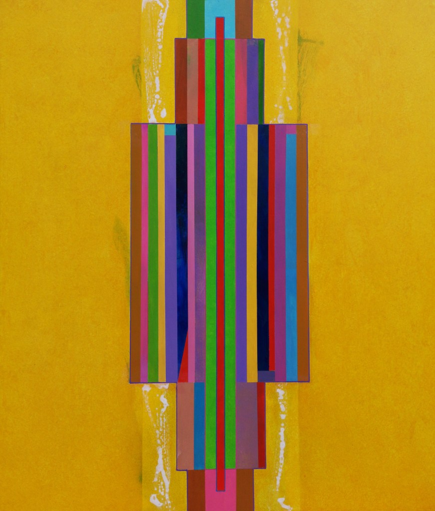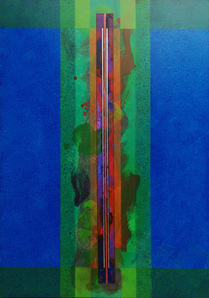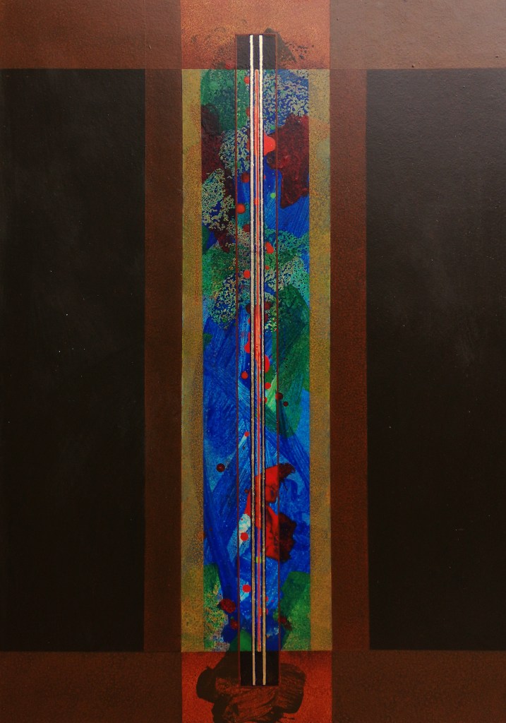 L’idea dell’albero visto come simbolo di congiunzione degli opposti, in un continuo susseguirsi di cicli, è antica ed universale. Alberi della vita, “alberi cosmici” visti come ascesa dalla terra al cielo, dalla materia allo spirito, da una condizione primitiva ad una più elevata. Anche questa ricerca vuole accostarsi all’idea dell’albero del mondo. La verticalità è essenziale nella simbologia dell’albero. E’ vita e qui viene rappresentata da un asse che collega il basso con l’alto, un asse interiore che, avente la base sulla terra, si evolve verso il cielo. Il colore è energia vitale, quella che permea tutto l’universo. E’ energia positiva, dinamica, quella stessa che viene evidenziata dalle foglie, dai frutti e dagli uccelli colorati presenti nel-le immagini medievali e rinascimentali che rappresentano la natura. Anche la forma geometrica è energia positiva. Nella sua essenzialità racchiude l’ordine e la razionalità. Fanno parte di una geometria simbolica le strisce parallele che servono da linee di congiunzione tra la morte e la vita e viceversa, in un’idea di rigenerazione che trascende lo spazio e il tempo.