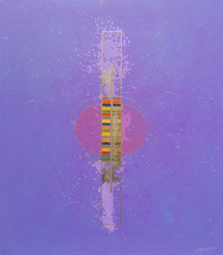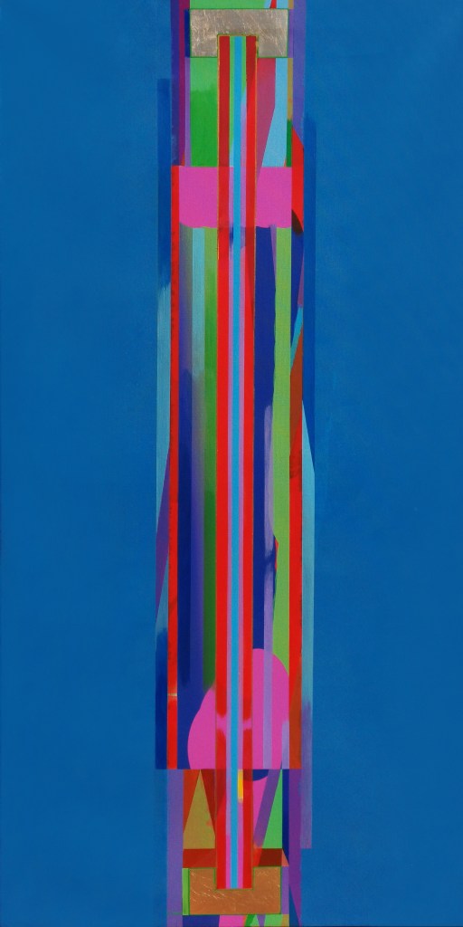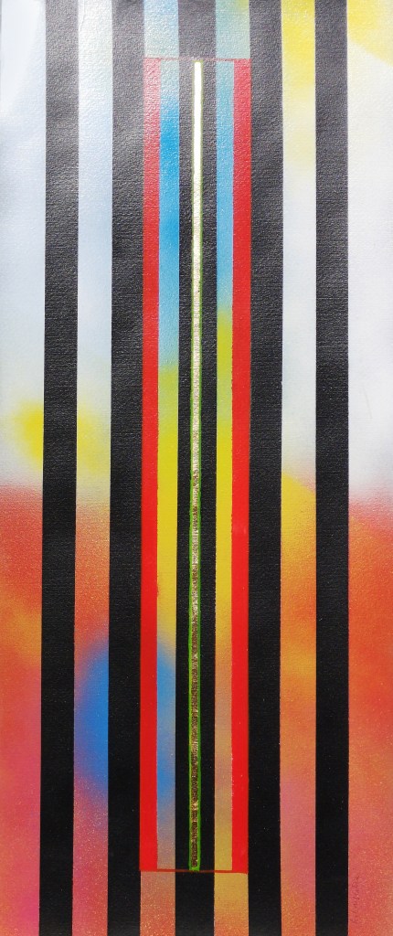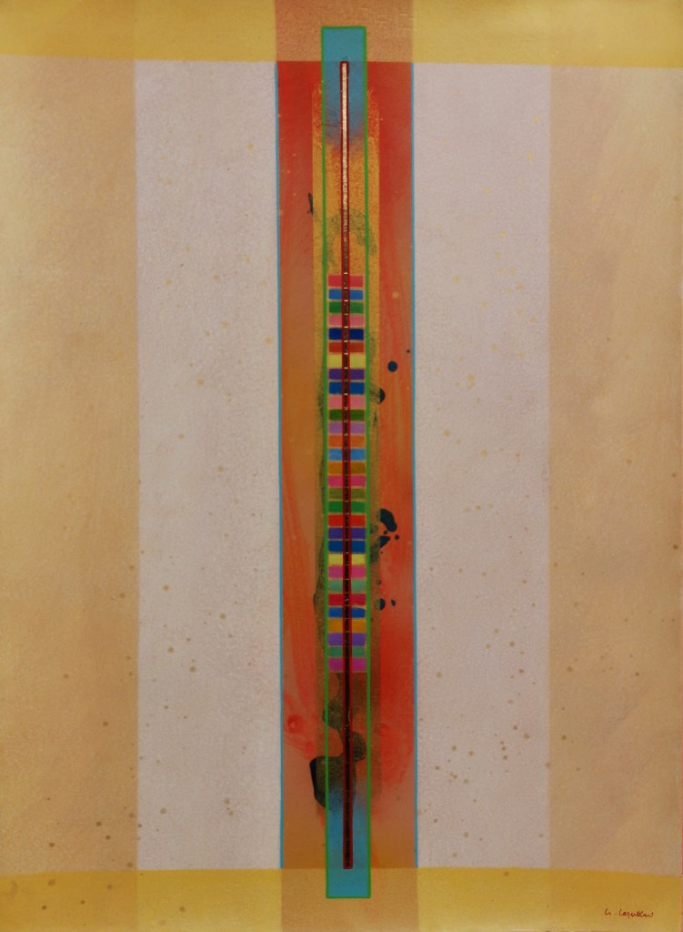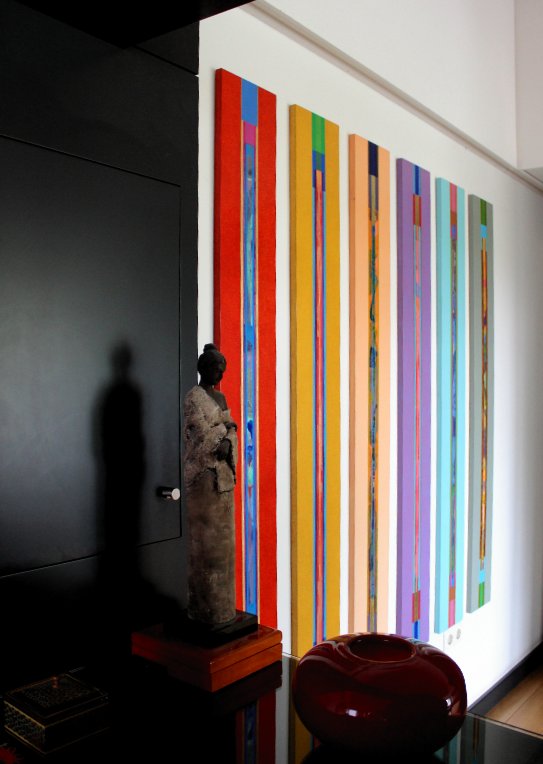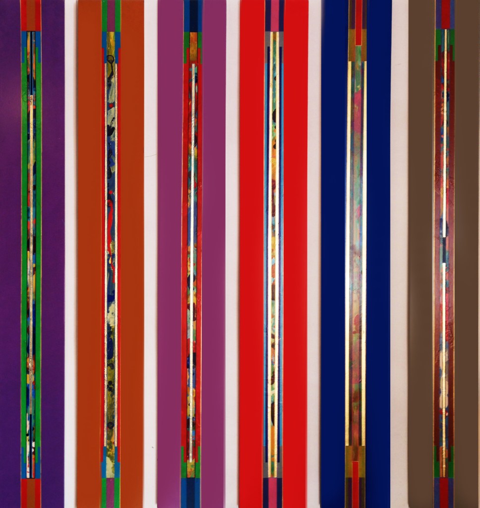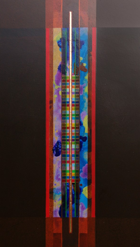 Nei “VERTICALI” compare appunto solo questa fascia significante. La simbologia del verticale è presente fin dalla preistoria: sono le stele, i menhir, le pietre fitte, gli obelischi, le colonne sacre. “L’axis mundi” degli alchimisti medievali, è un asse immaginario che congiunge la terra e il cielo, la materia e lo spirito, intorno al quale ruota il tempo e la vita generando la ciclicità degli eventi e “l’albero della vita o albero cosmico” che, traendo linfa vitale dalla terra e dal cielo, congiunge gli opposti in un continuo susseguirsi di cicli.