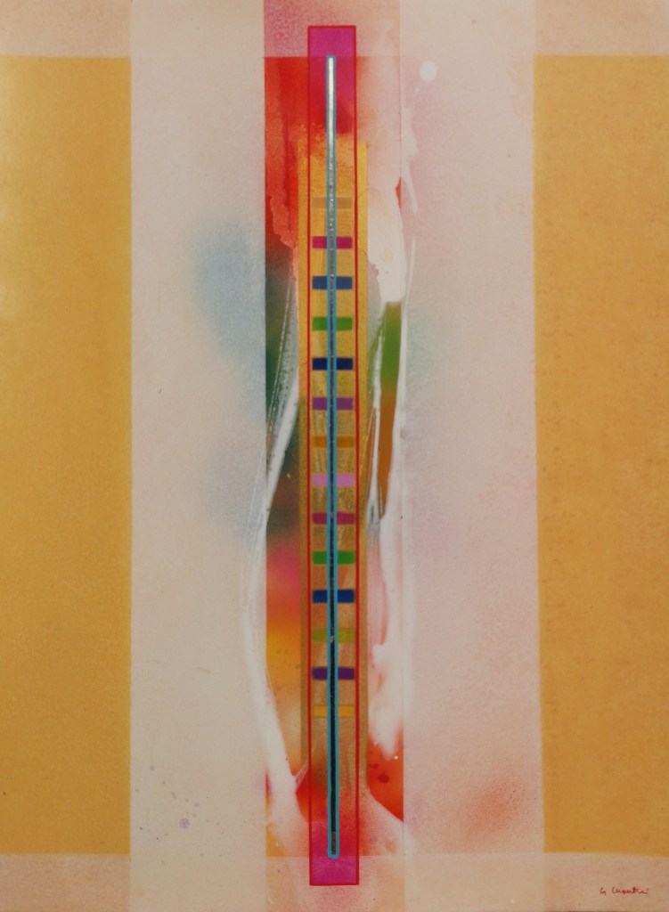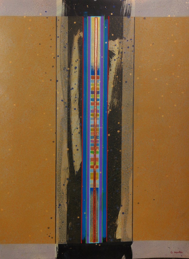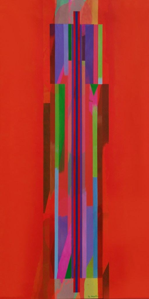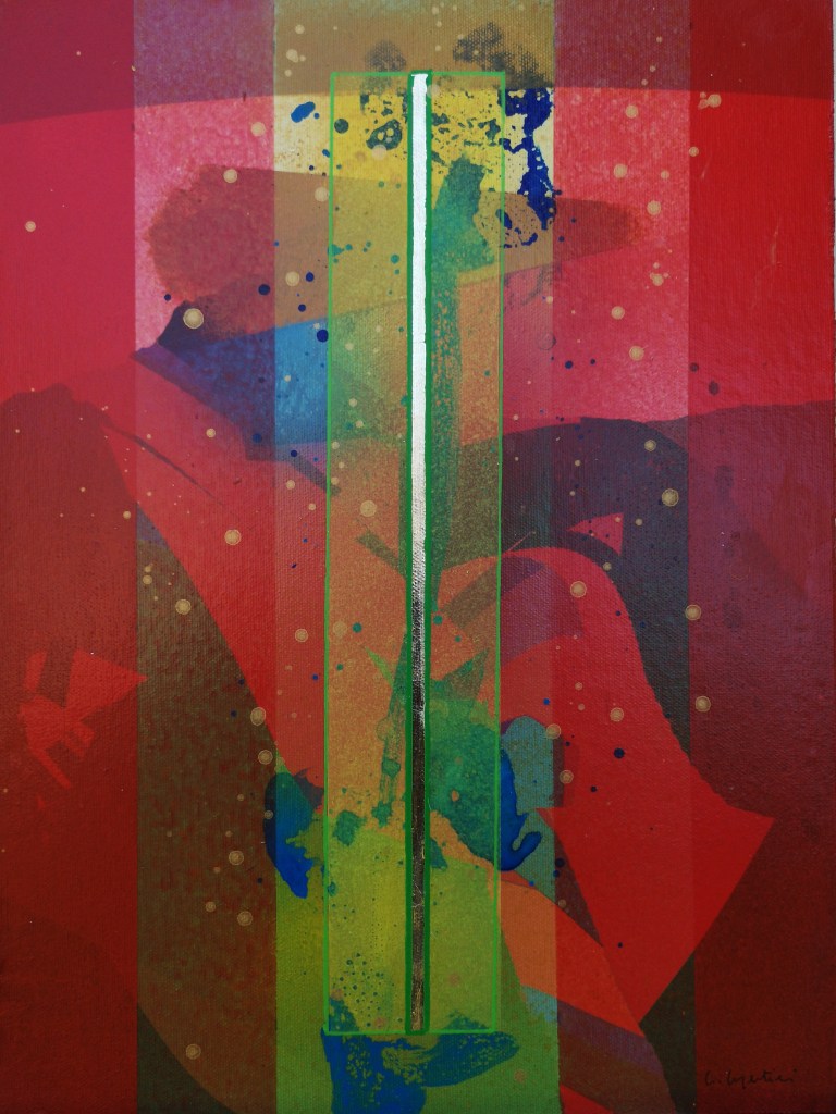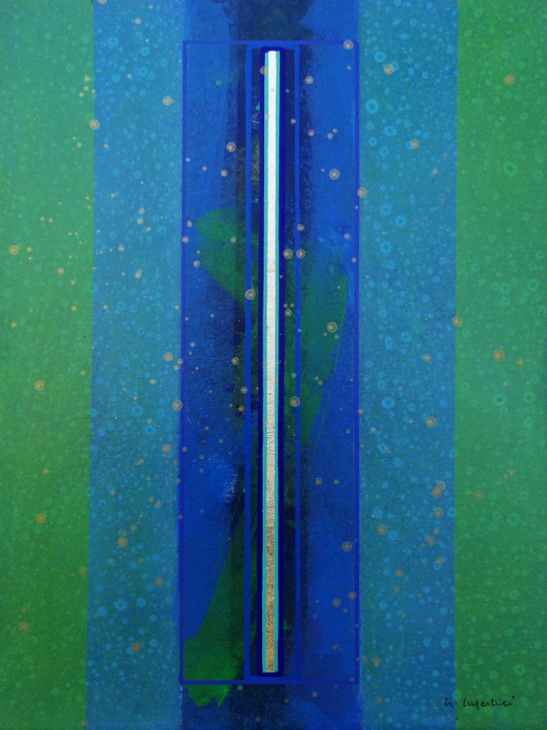 Nei “VERTICALI” compare appunto solo questa fascia significante. La simbologia del verticale è presente fin dalla preistoria: sono le stele, i menhir, le pietre fitte, gli obelischi, le colonne sacre. “L’axis mundi” degli alchimisti medievali, è un asse immaginario che congiunge la terra e il cielo, la materia e lo spirito, intorno al quale ruota il tempo e la vita generando la ciclicità degli eventi e “l’albero della vita o albero cosmico” che, traendo linfa vitale dalla terra e dal cielo, congiunge gli opposti in un continuo susseguirsi di cicli.